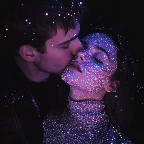 A photo of a white guy kissing a girl on the neck. He has his nose buried in her neck. The face of the guy is hidden. The girl is all covered in glitter, bright purple lilac glitter. --style raw