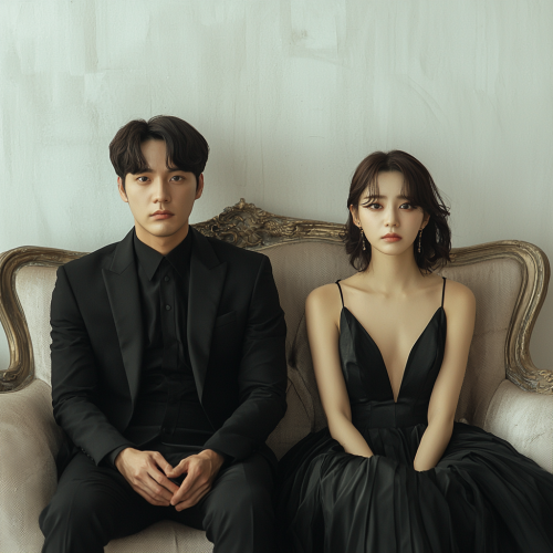 a guy about 25 years old, Korean appearance, dark hair, sitting on a light sofa, serious look, next to him sits a girl about 19 years old in a black dress sad, evening, --q 2