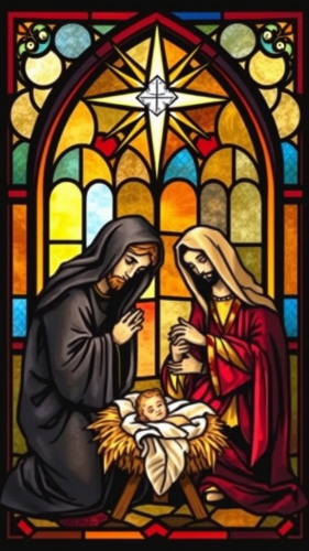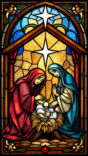 A blue colored star shines above the manger, with Mary and Joseph looking down at baby Jesus in his cradle. The background shows an arched window with intricate details, surrounded by a soft white glow. There is one lamb standing next to them. The stained glass artwork features white light, bright colors, a rich background, and is presented in high resolution in the style of stained glass. --ar 13:27 --stylize 250 --v 6.1