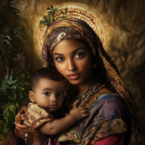 historically accurate mary of nazareth, beautiful dark brown golden skin, fingertips dyed red with henna, tribal dress, hair wrap, lots of jewelry including a large nose ring, include elements of nature and herbs in the background, shining halo behind her, around 30 years old, kind soulful eyes, she is holding her son Jesus of Nazareth, he’s a baby around 6 months old, dark hark hair and skin like his mother, he is staring up at her and smiling in adoration,oil painting, realistic hyper-detail, jarring juxtapositions, hauntingly beautiful illustrations, surreal trompe de l’oeuil