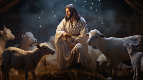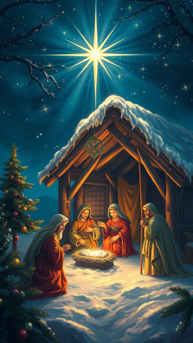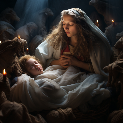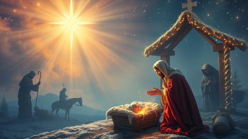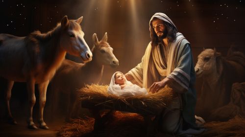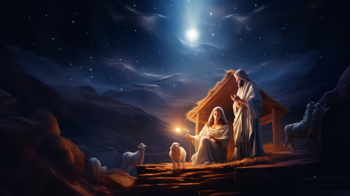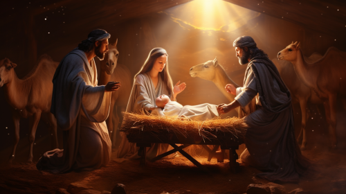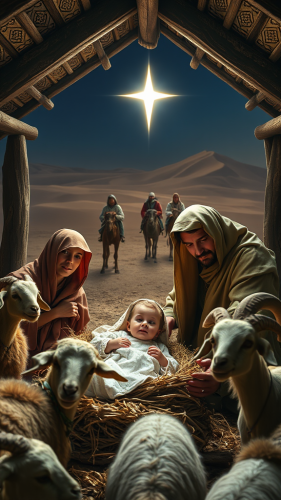 Jesus in a manger with Mary, Joseph and goats around them in a stable, bright star above the stable, three wise men on camels in the Desert, Hyper Realistic, surreal lighting, high detail, --ar 16:9