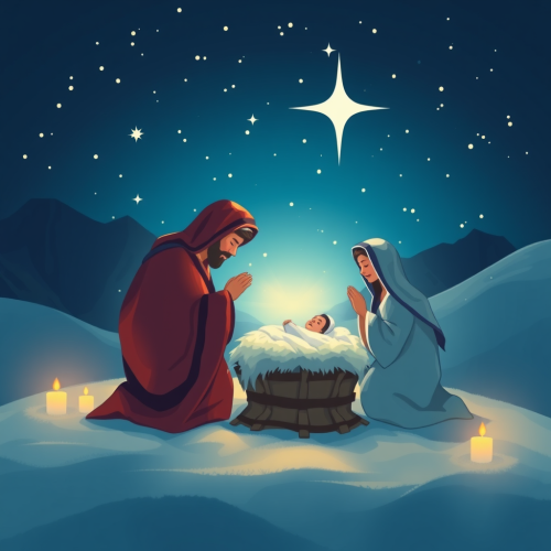 Jesus in a manger with Mary, Joseph in a stable with a bright star above the stable in the night sky, Hyper Realistic, surreal lighting, high detail, --ar 16:9