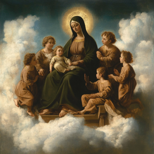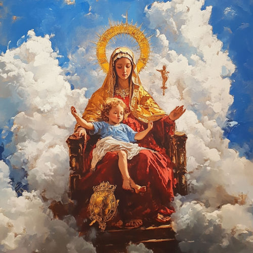 La Virgen, aparece sentada sobre un trono de nubes, en posición frontal, rodeada de querubines y sosteniendo al Niño Jesús sobre su rodilla derecha; ayuda al Niño a sostener con la mano derecha el cetro y con la izquierda el orbe; la cabeza de la Virgen aparece enmarcada por un halo de querubines; sobre su pecho muestra el escapulario con el escudo de la Orden carmelitana, lo que la identifica como patrona de la misma, en su advocación de MarÃa del Monte Carmelo. Estilo pintura clásica, renacimiento, óleo.