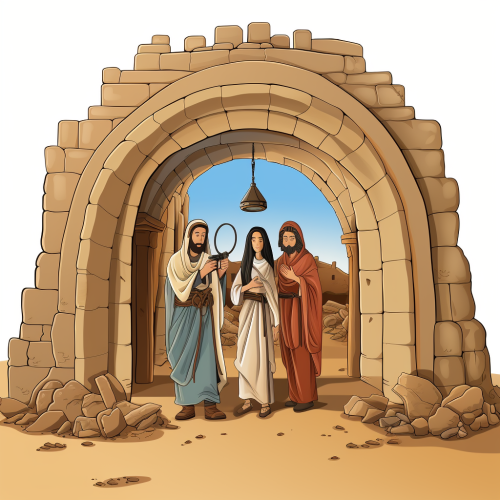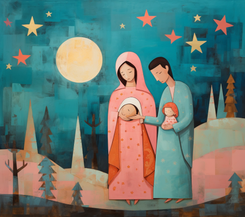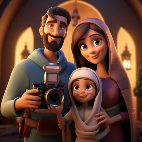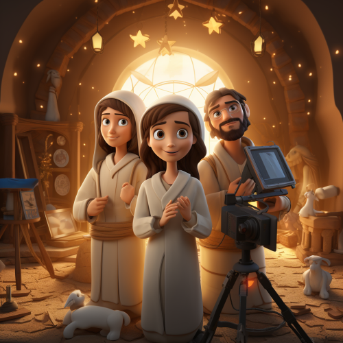 Bethlehem portal with baby Jesus, Maria and Joseph who have a video camera character. cartoon 3d pixar