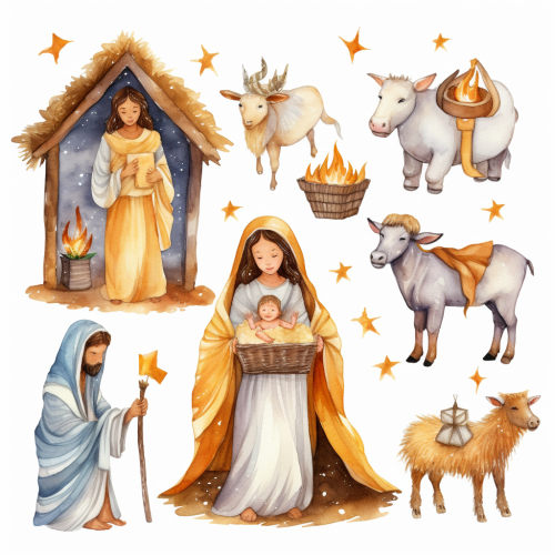 cartoon Holy Nativity Christmas watercolor clipart set, isolate white background