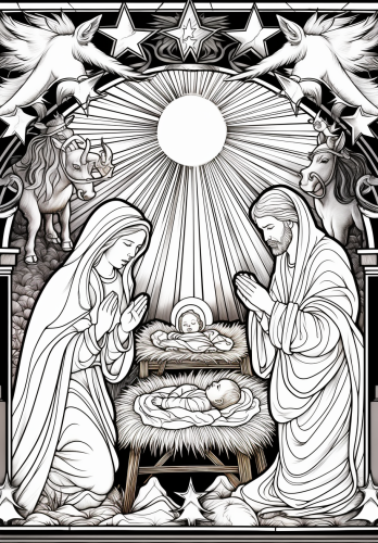 Coloring page of an overview of the manger where Jesus was born, intricate details of the stable structure, animals resting, Mary and Joseph by the manger, one bright star in the sky, black and white, line art, clean coloring book page, No dither, no gradient, strong outline, No fill, No solids, no shading, --ar 9:13 --v 5.2