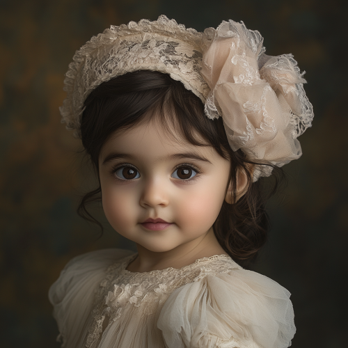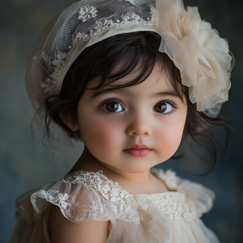 A one-year-old Iranian girl with dark hair, wearing a delicate tulle dress and a matching tulle hat. The dress and hat are adorned with subtle lace details. The background is softly lit, emphasizing the gentle and innocent expression on the child's face. The style is photorealistic with a warm and inviting atmosphere.