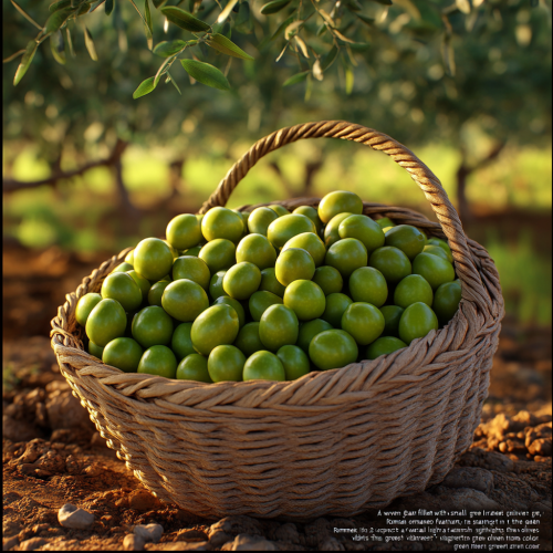"A woven basket filled with small, green Iranian olives, set against the earth in the olive grove. Inspired by Mark Romanek, the scene features a 3:2 aspect ratio, with natural light creating a warm glow that highlights the olives' vibrant green color and the texture of the basket. The background is softly blurred to emphasize the richness of the olives, showcasing the bounty of nature in a tranquil and inviting atmosphere."
