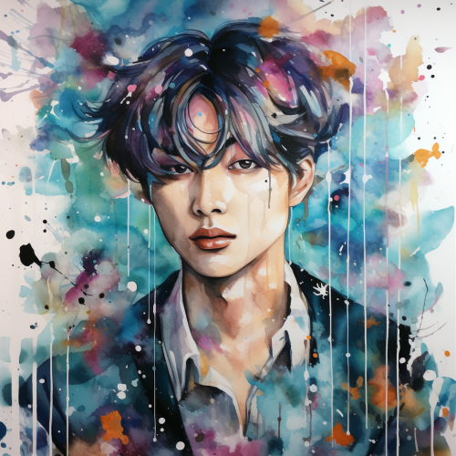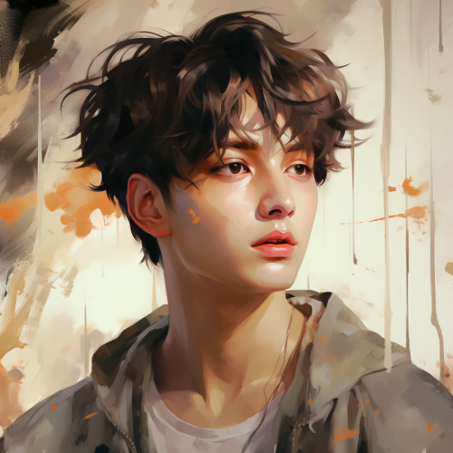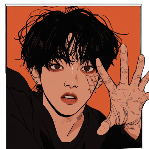 cartoon illustration of a Polaroid of a young Korean man, black choppy hair, curtains bangs, brown eyes, kohl eyeliner, Jungkook facial fractures, trying to hide from the camera by putting his hand up