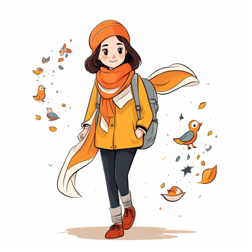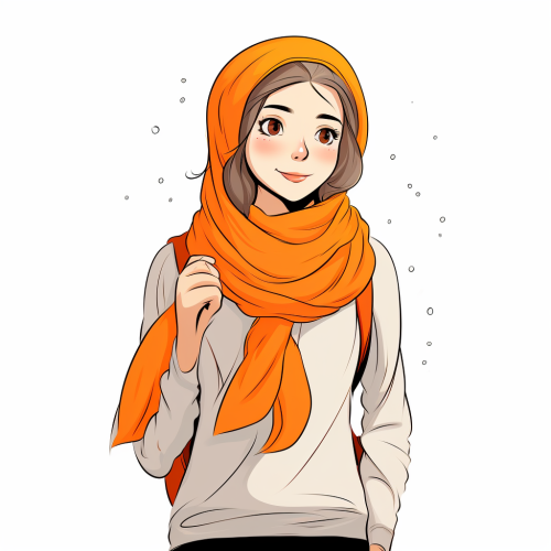 a Cartoon character that is in full color, with a full-length Iranian girl of 17 years old with an orange scarf in the style of playful line drawings, dutch tradition, kintsukuroi, simple line work, inspired by folklore, quito school, flat illustration, line art, minimalism - white background high neck