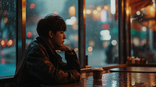Jungkook sitting in a coffee shop, it's cloudy and starting to rain, he's sitting by the window admiring the sky, he has a cup of coffee in his hand, photo realistic, cinematic, 8K, Meike 50mm F1.8 lens --ar 16:9 --style raw --v 6.0
