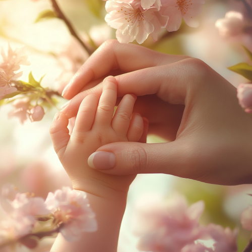 Imagine a touching scene where the hands of a mother and her child are intertwined. The mother's hand, with its soft skin and wrinkles from time, rests on top, while the child's hand, younger and more energetic, grips from below. Surrounding their hands, delicate pink flowers bloom, adding a touch of beauty and sweetness to the scene. The soft light of sunset illuminates this moment of connection and compassion between them.