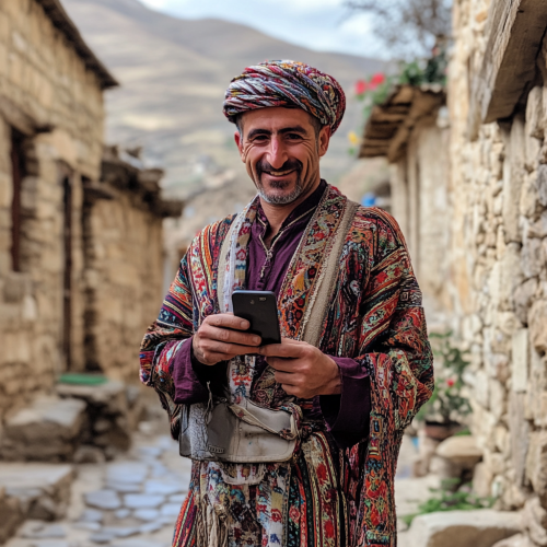 A Kurdish man standing in a charming, traditional Kurdish village, wearing traditional Kurdish clothing with intricate patterns and vibrant colors exactly as seen in the reference image, holding a mobile phone and smiling warmly as he looks at the screen. The village setting includes stone houses, narrow pathways, and scenic mountainous landscape in the background. The scene captures a blend of tradition and modernity, with natural lighting casting a warm, inviting glow. Emphasis on the authentic Kurdish attire and the man’s friendly expression.