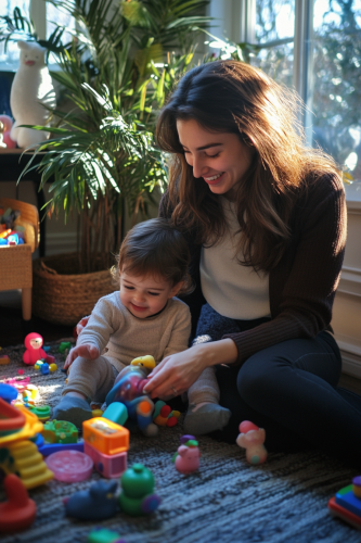 A young woman with brown hair, looking like a caring mother, is sitting on the floor and playing with a child with colorful toys scattered around them, creating a joyful and cozy atmosphere. The woman is smiling, and the child is happily engaged with the toys, seemingly unaware of the camera, as if they are being photographed from a distance. Photo taken on iPhone 8, posted to Snapchat, the photo is a bit dark --style raw --s 50 --ar 2:3