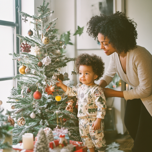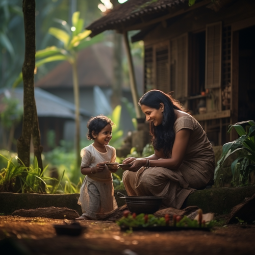 Cozy kitchen scene in the morning with a mother and young child having breakfast. The child is holding a vibrant, kid-friendly thermos cup with playful characters, while the mother smiles warmly. The kitchen is well-lit with natural light streaming through a nearby window, giving the space a soft and inviting atmosphere. The table has a mix of breakfast foods and fruits, with a focus on the child’s joyful expression and the colorful thermos. Soft, inviting colors, high detail, modern kitchen design –– photorealistic, warm and cozy.