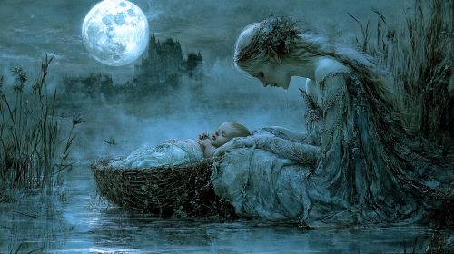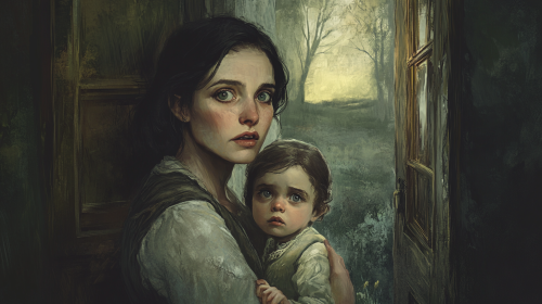 Capture the moment a mother realizes her child has been replaced by a changeling. Her expression is one of horror and disbelief as she holds the child, whose eyes betray its true nature. The background shows an Irish countryside through the open cottage door, with a distant, mystical forest where the real child is being taken, illustration style --ar 16:9