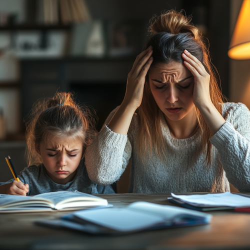 Mother doing homework with her child, frustrated expression, holding her head with both hands, child sitting at the table with school books, modern living room background, realistic photography, soft lighting, stressed atmosphere