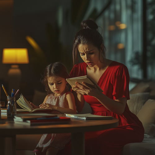 Mother in red dress doing homework with her child, frustrated expression, holding herea hd with both hands, child sitting at the table with school books, modern living room background, realistic photography, soft lighting