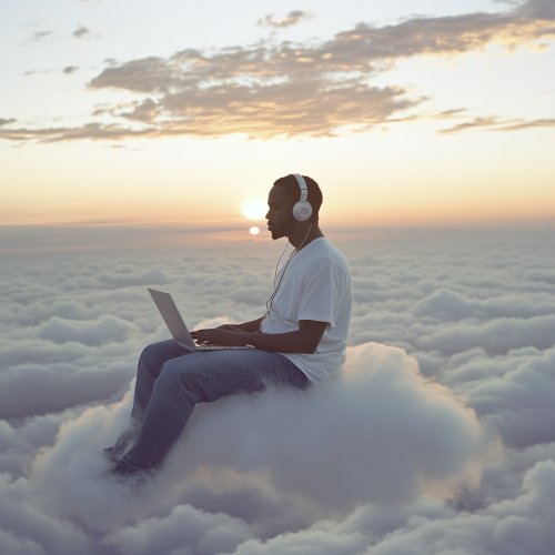 A distant, far-away shot of a young African-American man sitting calmly on a cloud, approximately 500 feet away from the camera. He has black skin and is dressed in urban clothing--jeans and a white t-shirt. He’s wearing headphones connected to his laptop, which is placed on his lap. The composition is perfectly level, with the man centered in the frame. Above him, the top half of the photo is filled with a soft, lunar sky, featuring a radiant sun beaming through. The bottom half of the photo shows a serene sunset casting warm, orange-pink light on the clouds beneath. The shot is captured in Kodak 8K, with a 9:16 aspect ratio, using slight motion blur for a dreamlike feel. The overall atmosphere is peaceful and surreal, combining both earthly and celestial elements as the man floats in the middle of the clouds and sky