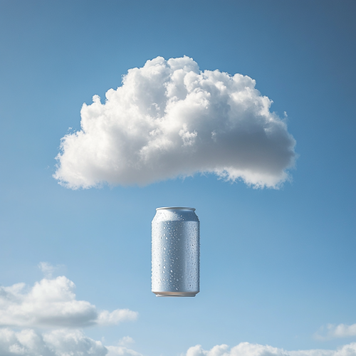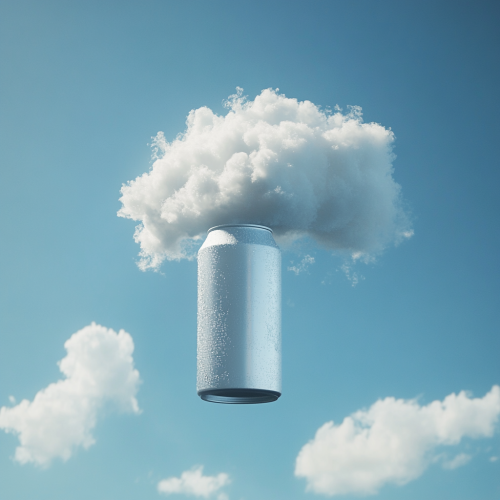 A cloud shaped exactly like a soda can, with smooth, cylindrical edges and a rounded top, floating in a bright blue sky. The cloud maintains the full shape of the can, including the top and bottom, but is made entirely of soft, fluffy cloud material. The texture is wispy and light, yet the structure is clearly defined as a can. Soft sunlight illuminates the cloud, giving it a surreal and whimsical look as it drifts in the sky --chaos 40