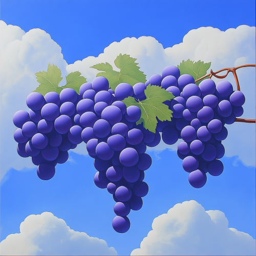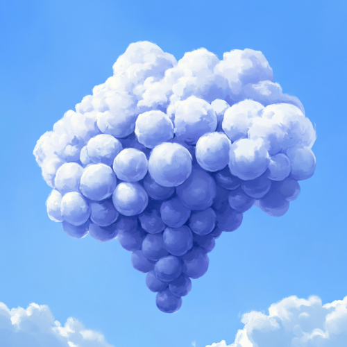 A cloud shaped like a cluster of grapes, floating in a bright blue sky. The cloud has distinct, round grape-like formations, with soft, fluffy textures. . The sunlight gently illuminates the cloud, casting soft shadows and giving it a dreamy, whimsical appearance. Realistic yet slightly surreal, with a sense of wonder and creativity in the sky --v 6.1