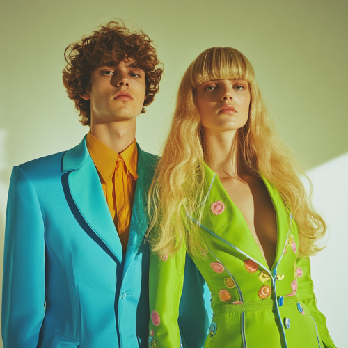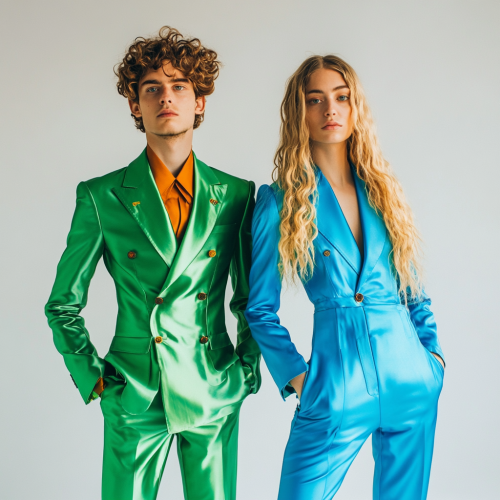 Two Lala land inspired utopian wrapped suits. Androgynous with one being green and the other bright blue. One male with brown curly mullet and one female with long blonde hair