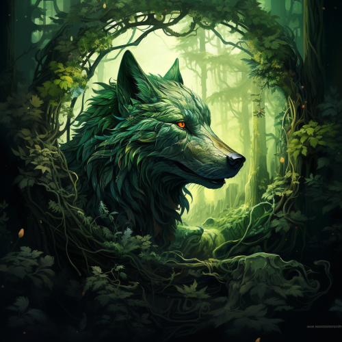 a wolrd of green, forest elements, with the subject in the pixture in the midle