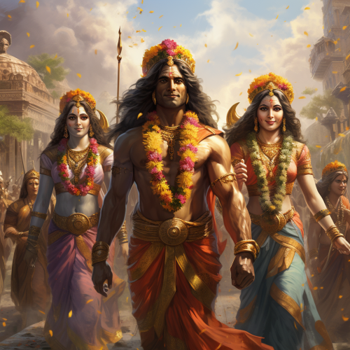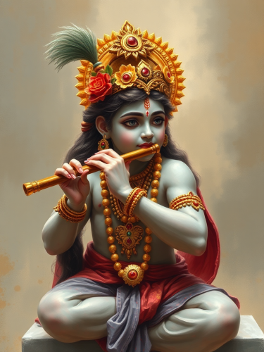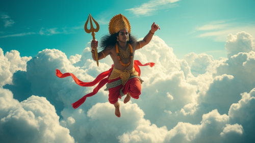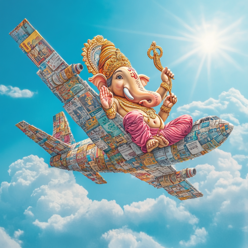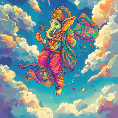 Lord Ganesh flying through the sky in a colorful, whimsical art style reminiscent of traditional Indian paintings, vibrant colors, intricate patterns, joyful expression, surrounded by fluffy clouds --ar 1:1 --s 150 --no text