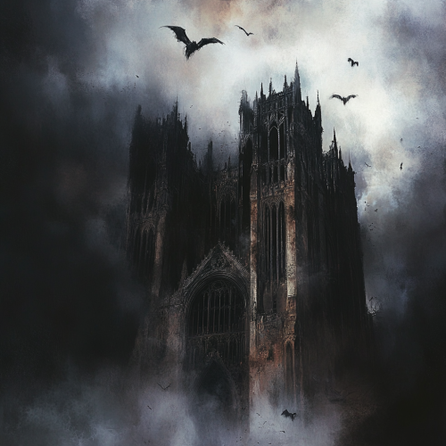 demons flying around neobrutalist gothic cathedral, extremely dark clouds, melancholic eerie style, zoomed out photography, painting, realistic oil paint
