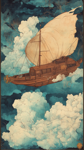 Epic fantasy image of wooden airship flying through misty clouds, in style of Moebius and Alphonse Mucha, epic fantasy art, high saturation, very detailed --v 6.1 --ar 9:16
