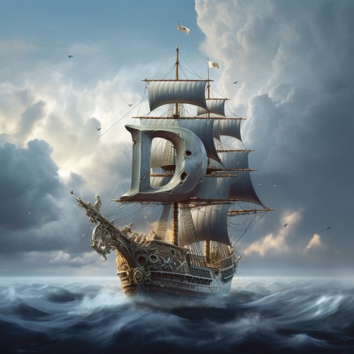 Flying ship with pirates, the main sail in the form of D letter, going through the silver clouds