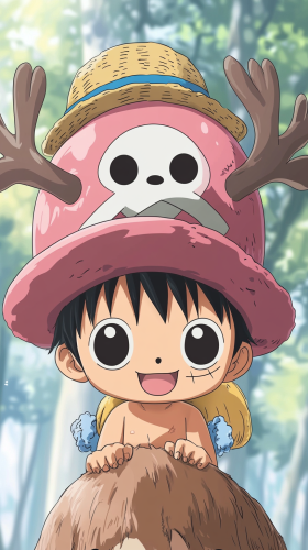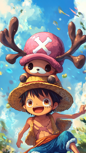 Create a chibi-style scene with Tony Tony Chopper from One Piece sitting on Monkey D. Luffy's head. Chopper should be in his cutest chibi form, with big, sparkling eyes, small antlers, and his signature pink hat. Luffy, with his iconic straw hat, should look playful and slightly surprised as Chopper balances on his head. The background can be simple and fun, capturing the lighthearted friendship between the two characters, with bright colors and a cheerful atmosphere High quality, 8k resolution. --ar 9:16