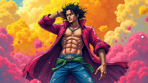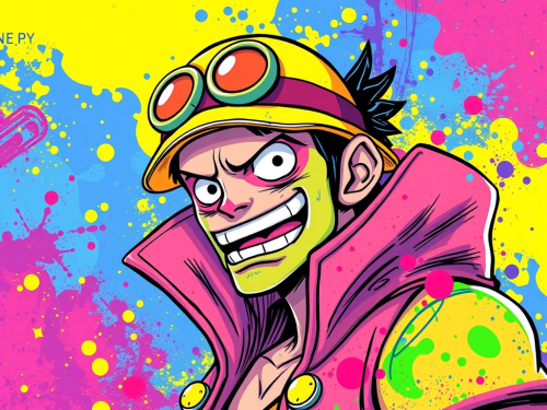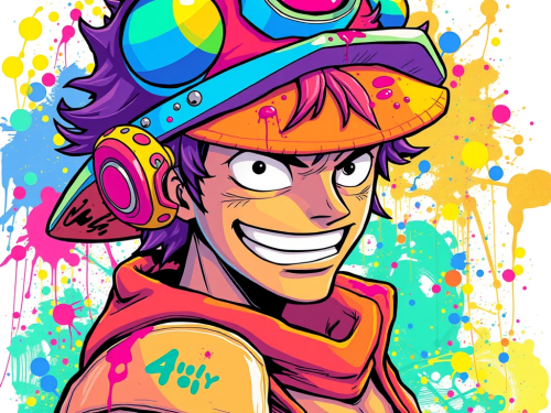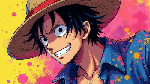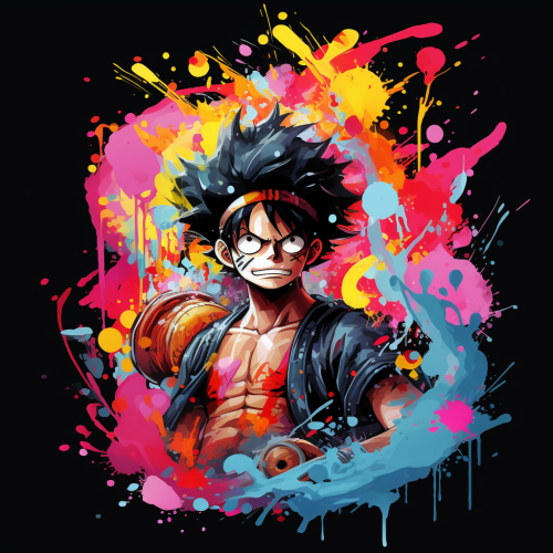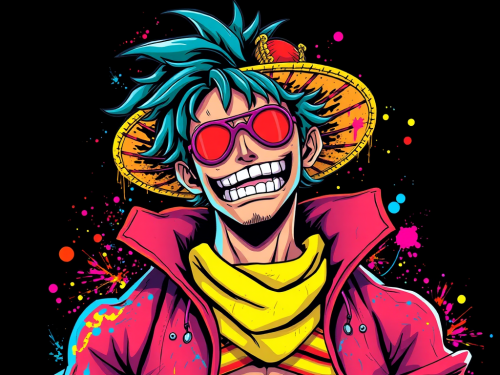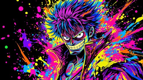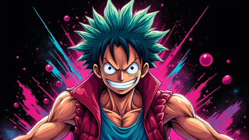 luffy gear 5 with psychedelic neon colors, crisp cartoon drawing, one piece, vivid colors, bold shapes, amazing colour blocking, paint splatters, Disney style