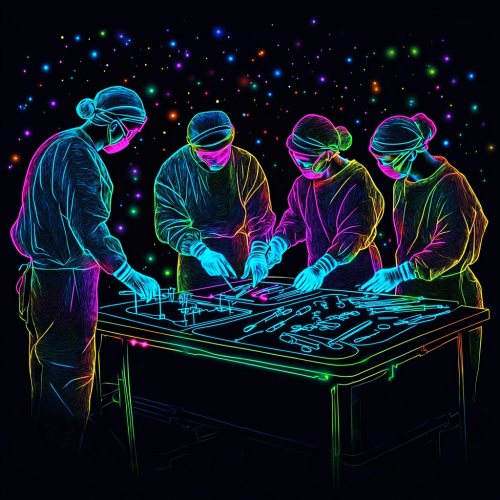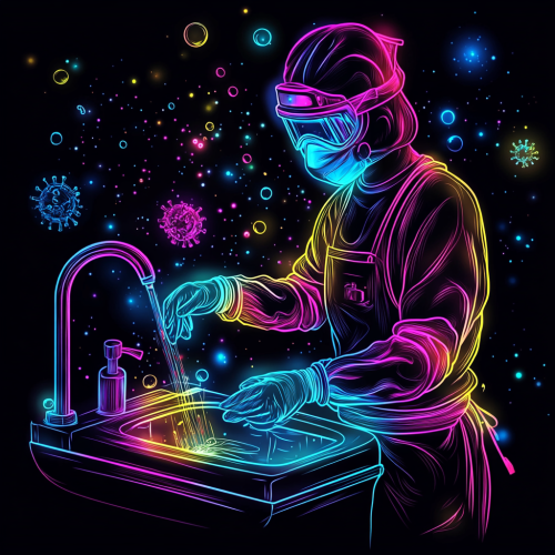bright neon sterile processing technician, fighting microbes, cleaning medical devices in a sink, neon water drops, outline drawing, glowing colour, black background with neon nebula