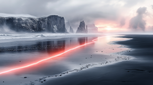 A long, glowing pink neon light river on the black sand beach in Iceland, in the style of minimalism and photography --sref 1774789034 --ar 16:9 --s 800