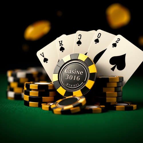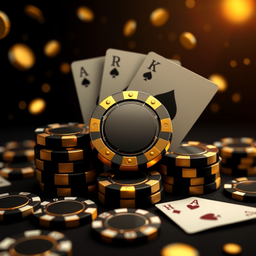 A stack of colorful poker chips and two cards, an Ace and a King, placed neatly on a smooth, green felt poker table, with blurred players in the background --ar 16:5