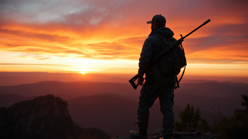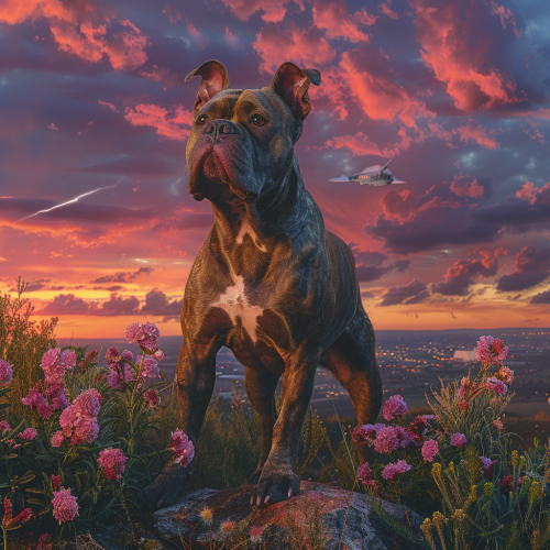 A digital composite image featuring a muscular American Bully dog standing on a rocky outcrop in the center of the scene. The dog has a brindle coat with a distinctive white mark on its chest and a white forehead, a short snout with a pink muzzle, and pointed ears. Its expression is stern and alert as it faces slightly to the left of the camera. In the foreground, there are green bushes with vibrant pink flowers and jagged rocks surrounding the dog. The background showcases a breathtaking sunset with a vibrant sky transitioning from deep purple and blue at the top to warm orange, yellow, and pink near the horizon. The setting sun casts a soft, warm glow across the landscape, illuminating the scene with a mix of warm and cool tones. Distant city lights are visible, suggesting a sprawling urban area below. The sky is adorned with scattered clouds, including a prominent dark cloud on the right and a lighter, wispy cloud above it. A thin, bright white trail from a departing rocket or spacecraft cuts diagonally through the sky from the bottom left towards the upper right. Two small, white bird-like objects float near the top of the image, adding to the surreal atmosphere. The overall composition creates a majestic and dramatic scene, with the dog as the central focus against the backdrop of a picturesque landscape. --s 750 --v 6.0