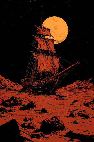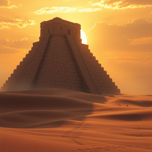 Create a cinematic image of an ancient ziggurat rising from the desert sands, framed by a dramatic sunset. Above the structure, a colossal, surreal spaceship looms, partially obscured by swirling storm clouds. The air is charged with energy, in a surreal, otherworldly landscape. Artstyle painting --ar 16:9