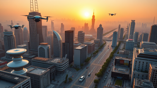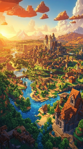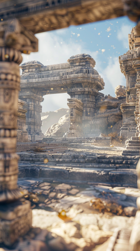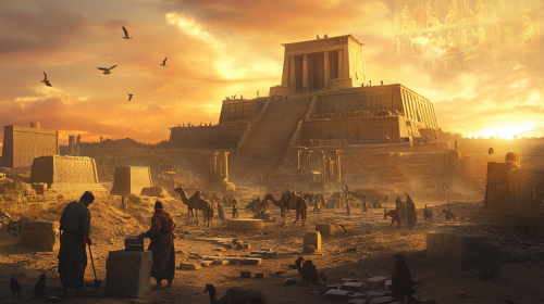 A vibrant archaeological scene depicting the ruins of ancient Mesopotamian cities like Ur and Nineveh at sunset, casting a warm golden light on the sandy terrain. In the foreground, several archaeologists in work attire are carefully excavating, using tools like shovels and brushes, focused on their task. Surrounding them are various clay tablets inscribed with cuneiform writing, alongside beautifully crafted ancient statues and artifacts, showcasing the artistry of the civilization. Partially visible is a grand temple ruin with towering stone columns and intricate carvings, hinting at its former glory. In the background, desert wildlife like camels and birds coexist with the ruins, symbolizing the natural environment. Above the scene, translucent images of ancient Mesopotamian life--farmers working the land, bustling marketplaces, and ritual ceremonies--create a dynamic contrast, emphasizing the intersection of history and discovery. The color palette features soft earth tones and warm hues of sunset, enhancing the atmosphere of exploration and reverence for the rich heritage of this ancient civilization --ar 16:9