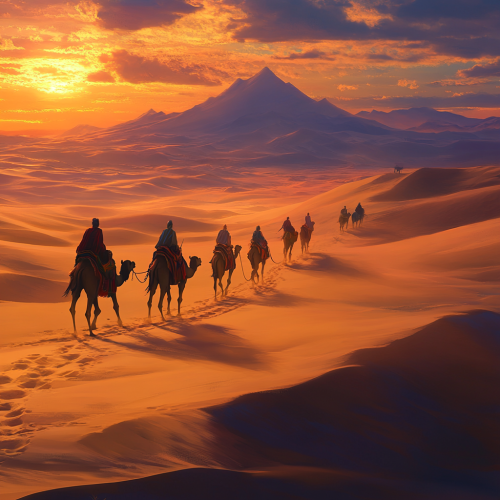 A group of desert nomads traveling across vast sand dunes, with camels carrying supplies, colorful tents in the background, and a golden sunset casting long shadows, 1:1 --v 6.1
