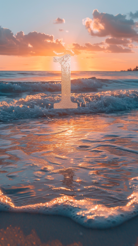 Photorealistic ‘1 MONTH’ text floating mid-air above a serene white sand beach during a breathtaking sunset, with vibrant orange and pink hues lighting up the sky. The large, bold text appears wet as ocean waves gently splash onto it, droplets of water glistening in the sunset. The water reflects the vivid sky, while soft sand and distant waves add depth to the scene. Realistic textures on the wet ‘1 MONTH’ letters, capturing the smoothness of the water and the glow of the sunset. --v 6.0 --ar 9:16