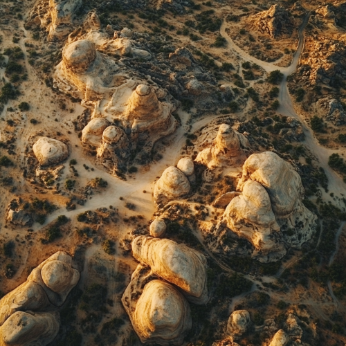 Aerial view of unique rock formations in a desert, with golden hour lighting casting deep shadows, showcasing natural patterns and textures, surreal and mysterious atmosphere, ultra-realistic, Instagram aesthetic