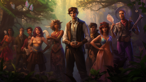 1920s 1930s America fantasy style, diverse D&D adventuring party, close up shot, background is dense dark forest with many tall trees, vivid color --ar 16:9