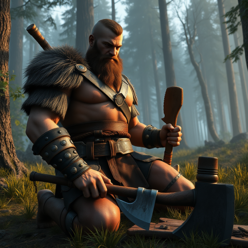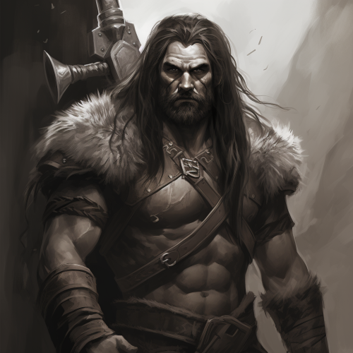 Human barbarian, twohanded hammer, long black hair, human, male, 35 years old, normal clothing, no armor, remarkable bracers, no beard, realistic, forgotten realms, dungeons and dragons, tall, powerful build, viking, drawn pencil style