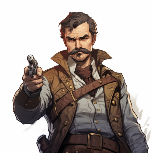 d&d character art. Comic style, white background. Hardy militia captain. Built, with a mustache