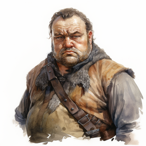 middle-aged, average man, plain looking, fantasy clothing, overweight,clean-shaven, sad eyes, D&D art, watercolour illustration