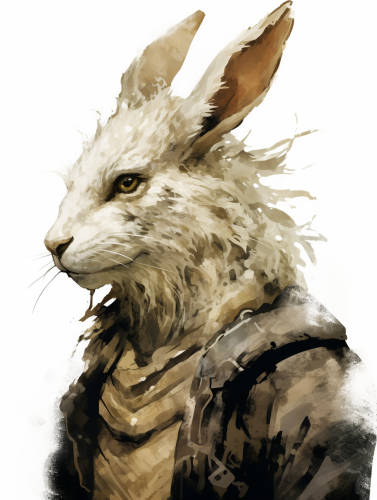 D&D portrait closeup. view from profile. Harengon rabbitfolk barbarian with beige fur. Castaway clothing, claws. Aggressive feral mood. alcohol ink style, strong shadows. white background. --v 5.2 --ar 3:4