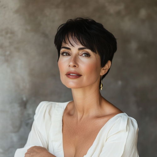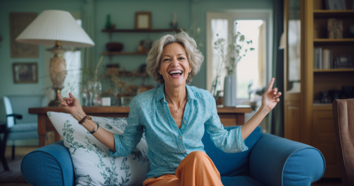 happy woman in her 50s, ex-model, in her beautiful home, glad about retirement, --v 5.2 --ar 19:10
