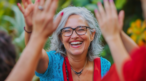 A fun, lighthearted image of a group of middle aged diverse business women celebrating a small win with a big smile. Age 45 years old. excited and playful. Wearing red and blue. Keywords: playful, celebration, high-five. Camera: DSLR, Lens: 35mm. Post: Bright, cheerful, with high contrast for a fun, celebratory feel. --ar 16:9