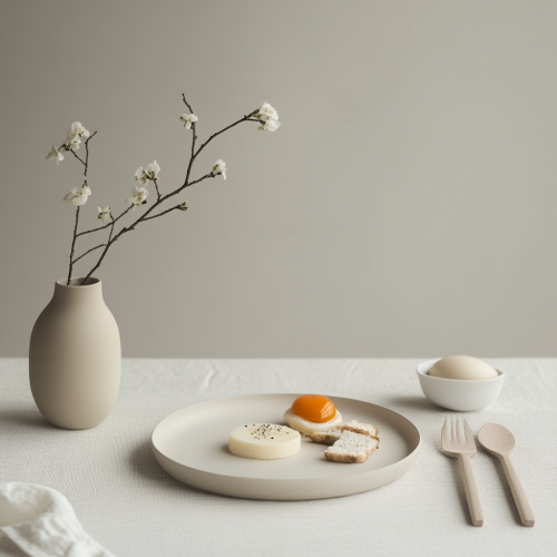 A beautifully arranged breakfast with clean, minimalist design, featuring simple lines and geometric shapes. The composition includes a modern plate with elegantly arranged food, soft natural lighting, neutral tones, and a serene, calming background. The overall aesthetic is minimalistic yet inviting, with balanced proportions and a peaceful atmosphere.